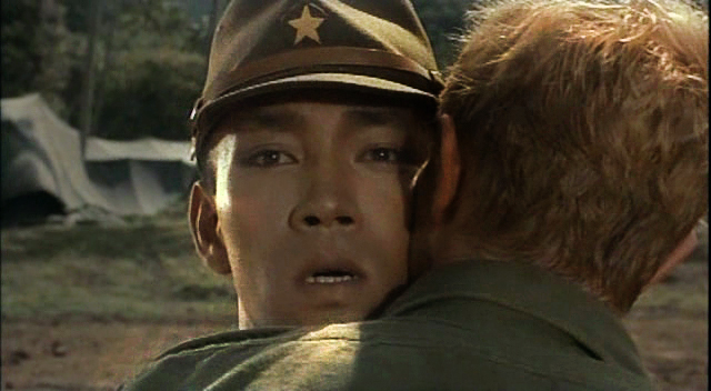 MCML is hampered somewhat by being in both English and Japanese, and in very difficult to follow English at that when spoken by Japanese actors who seem to have been learning the language line by line from a dialect coach on the set. While David Bowie’s performance has been justly heralded by critics since the film’s release, few seem to have anything good to say about Ryuichi Sakamoto’s. In fact, Sakamoto (a Japanese rock star who also wrote the film’s haunting score) has the more difficult part, not only for being half in a language he’s clearly not comfortable in. His character, Capt. Yonoi, is an aloof and insecure young aristocrat, steeped in bushido culture, in charge of an international PoW camp and the working class soldiers, like Sgt. Hara (Takeshi Kitano) who run it. Unlike Bowie’s Maj. Celliers, who is frank and confident and close to transparent in his emotions (oddly enough for a Bowie character), Yonoi is repressed, conflicted and often inscrutable. It becomes clear, nevertheless, that one of Yonoi’s “secrets” is his erotic attraction to Celliers. Sakamoto’s appearance (is that eye-liner and blush he’s wearing?) is even more androgynous than Bowie’s. His Yonoi is as close to female as a male can get and still be male.